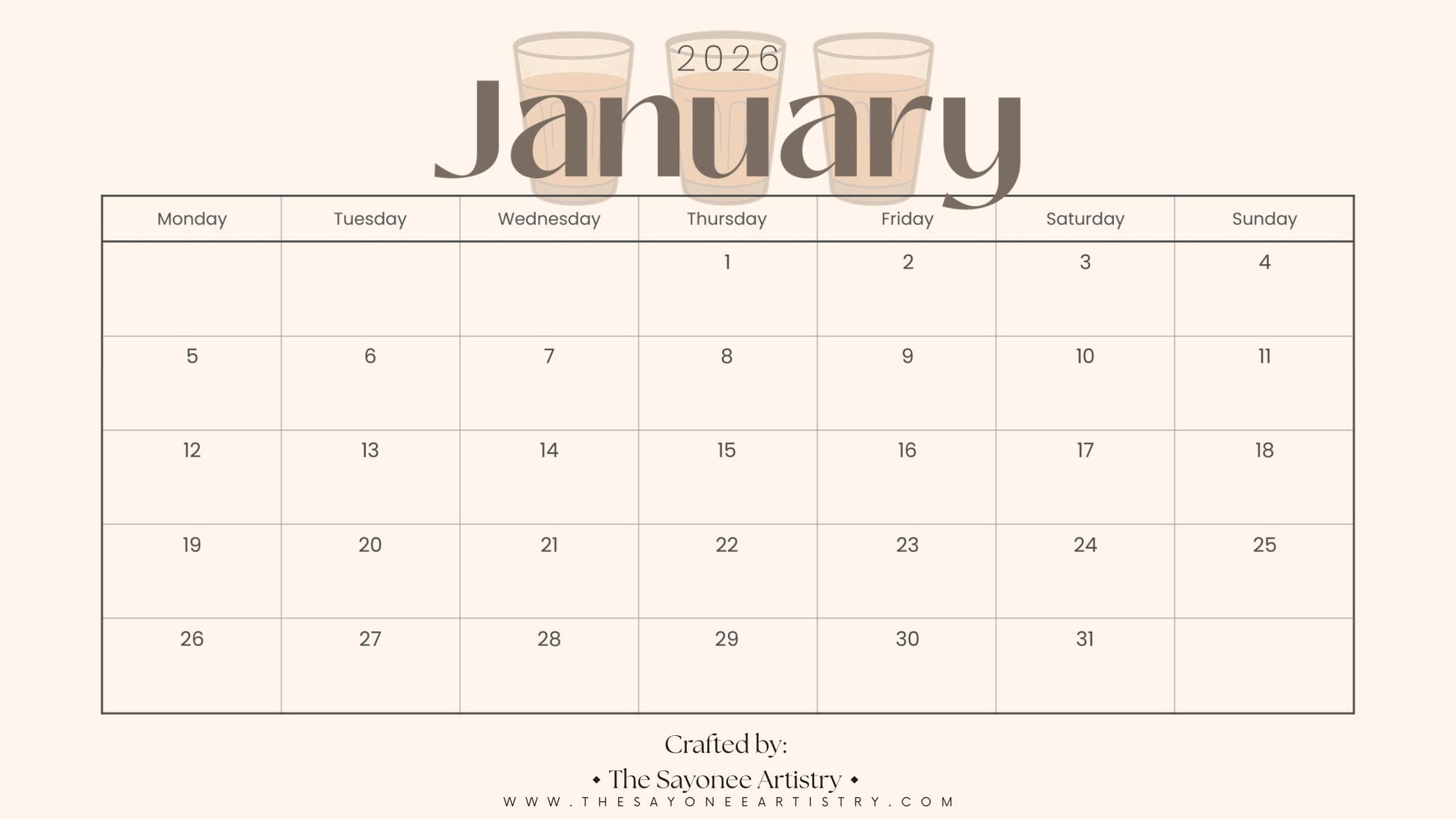 A clean, minimal January calendar designed by Sayonee Artistry, created for those who like their planning calm, intentional, and visually grounding .